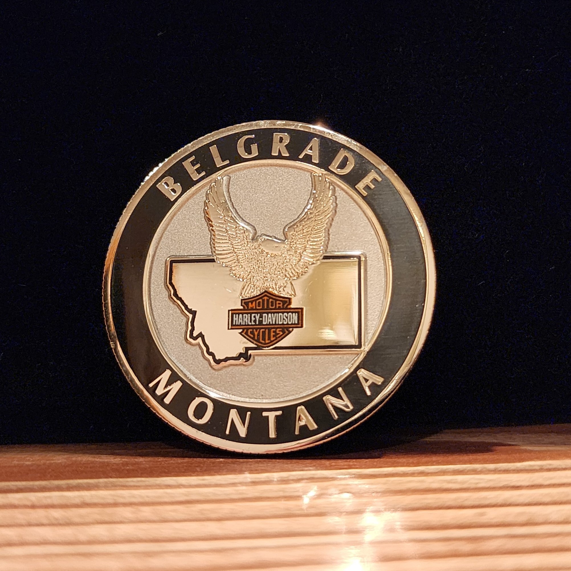 Back by popular demand! Yellowstone Harley-Davidson challenge coin with our classic steer skull design on one side and the state of Montana on the other side with our location, Belgrade, Montana.
