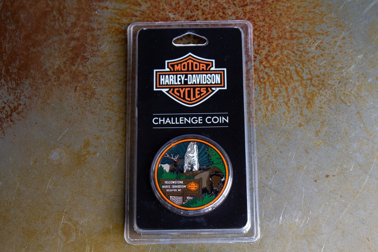Yellowstone Harley-Davidson challenge coin with an elk and bison design on one side in front of Mammoth Hot Springs and the state of Montana on the other side with our location, Belgrade, Montana.