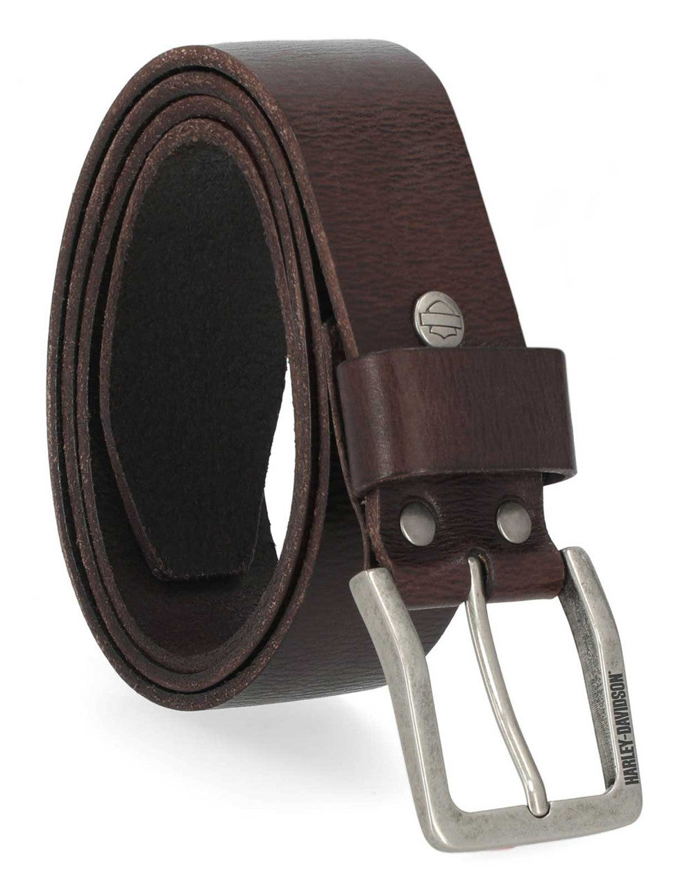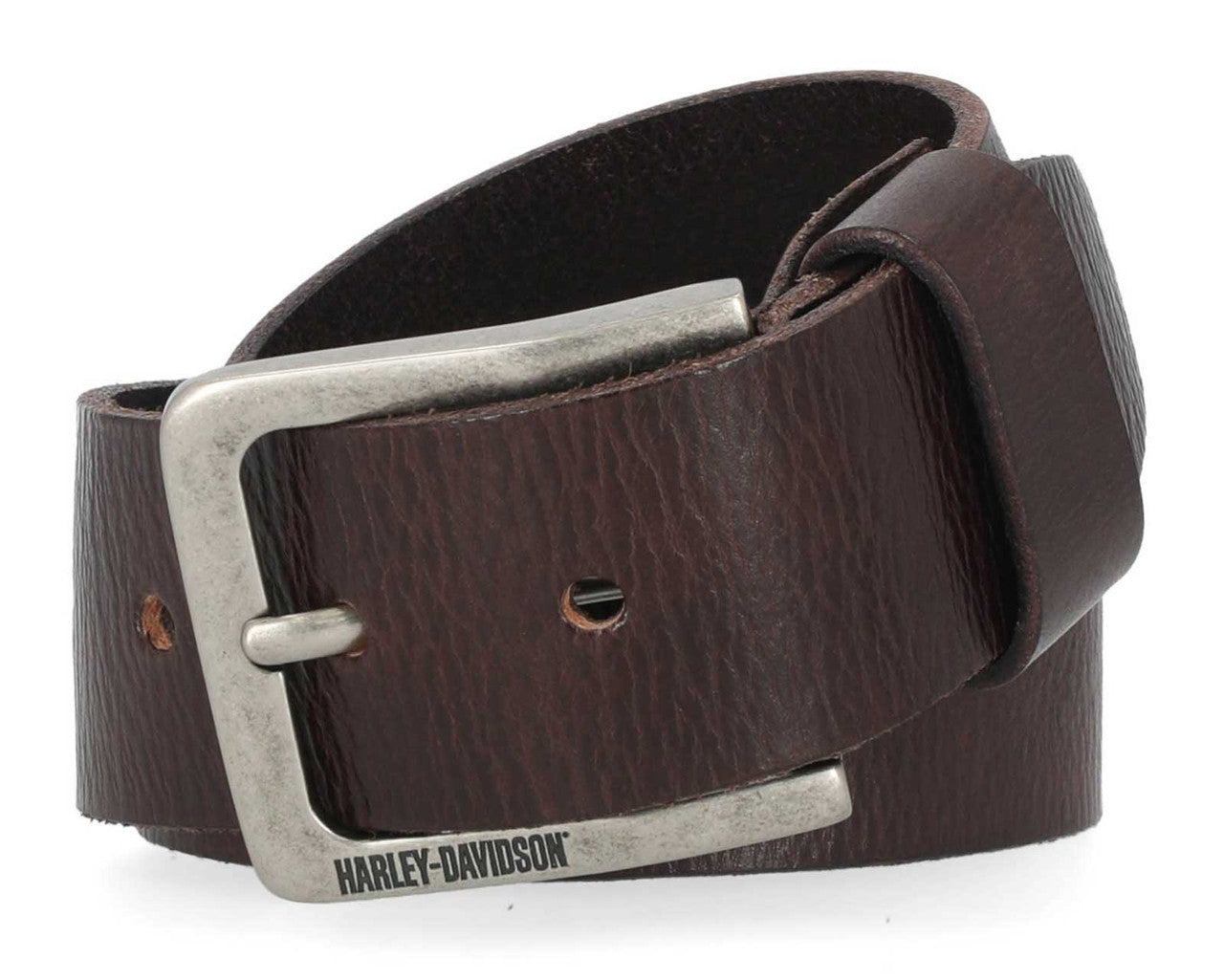 Harley-Davidson® Men's Embossed Leather Belt - Brown, BMM007/55. This belt is tough and ready for the ride. Constructed from high-quality genuine leather. Features embossed Harley-Davidson® script in oversized letters. Matte 'Gunmetal' finish. Has interchangeable belt buckle. 38mm wide.