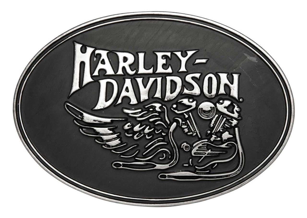 Harley-Davidson® Men's Motorcycle Belt Buckle, HDMBU11781. Collector belt buckle in gift box. Polished nickel finish. High-quality heavy-duty buckle that is ready for the ride. Engraved winged motorcycle design. Would pair great with a H-D® leather belt! Perfect accessory to "Biker-Up" any outfit. Fits 40mm wide strap. Size: 4" x 2.5". HDMBU11781