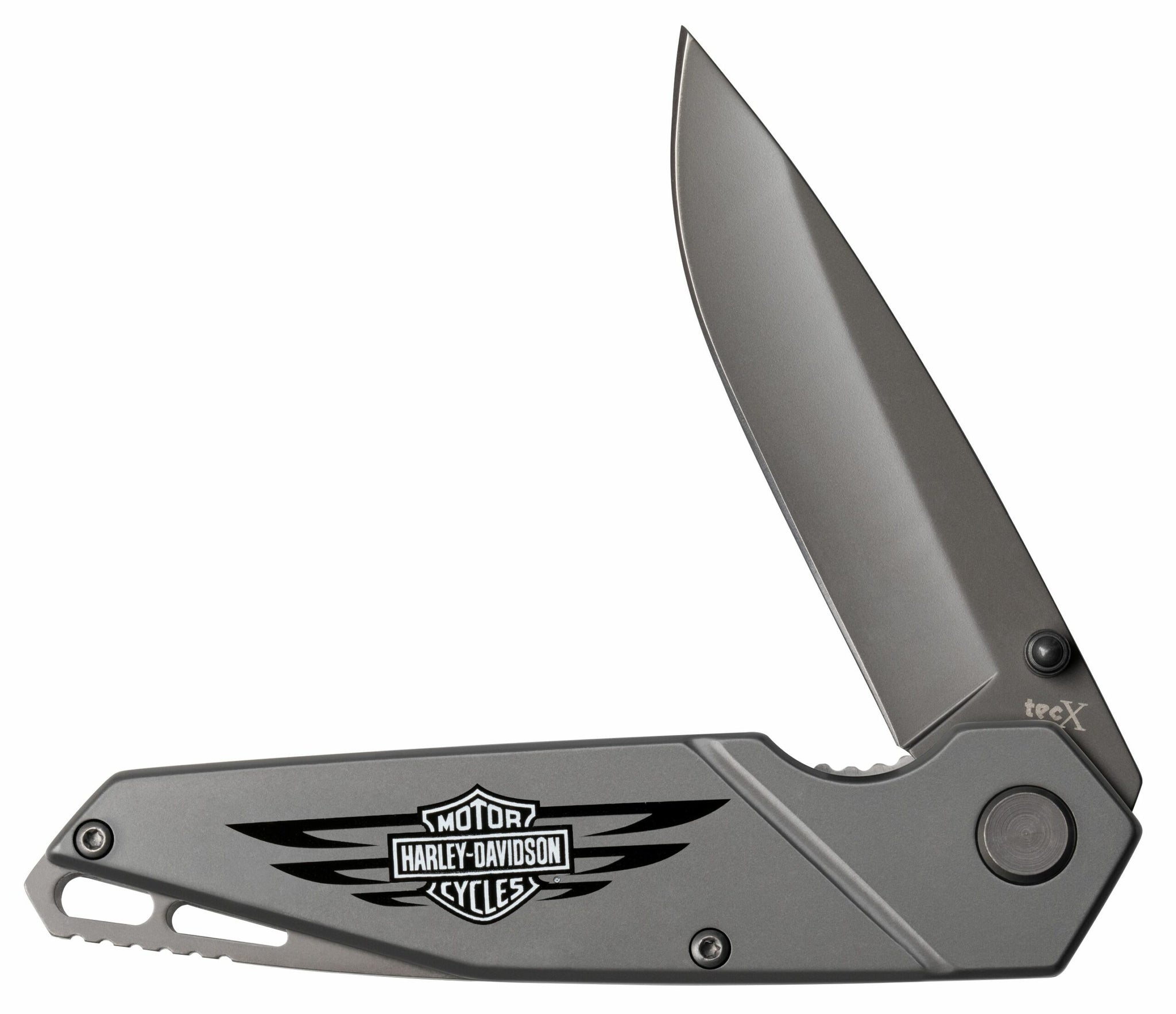 The Tec-X Harley-Davidson TS1-T Linerlock Folding Knife (Gray) features a 3.25″ 440 stainless steel drop point blade with a gray titanium nitride coated finish. It’s a manual folder with ambidextrous thumb studs. This linerlock has gray titanium nitride coated stainless steel handles with an etched Harley-Davidson front handle graphic, a stainless steel pocket clip, and a stainless steel backspacer with a lanyard slot. It’s 4.5″ closed and weighs 5.4oz.
