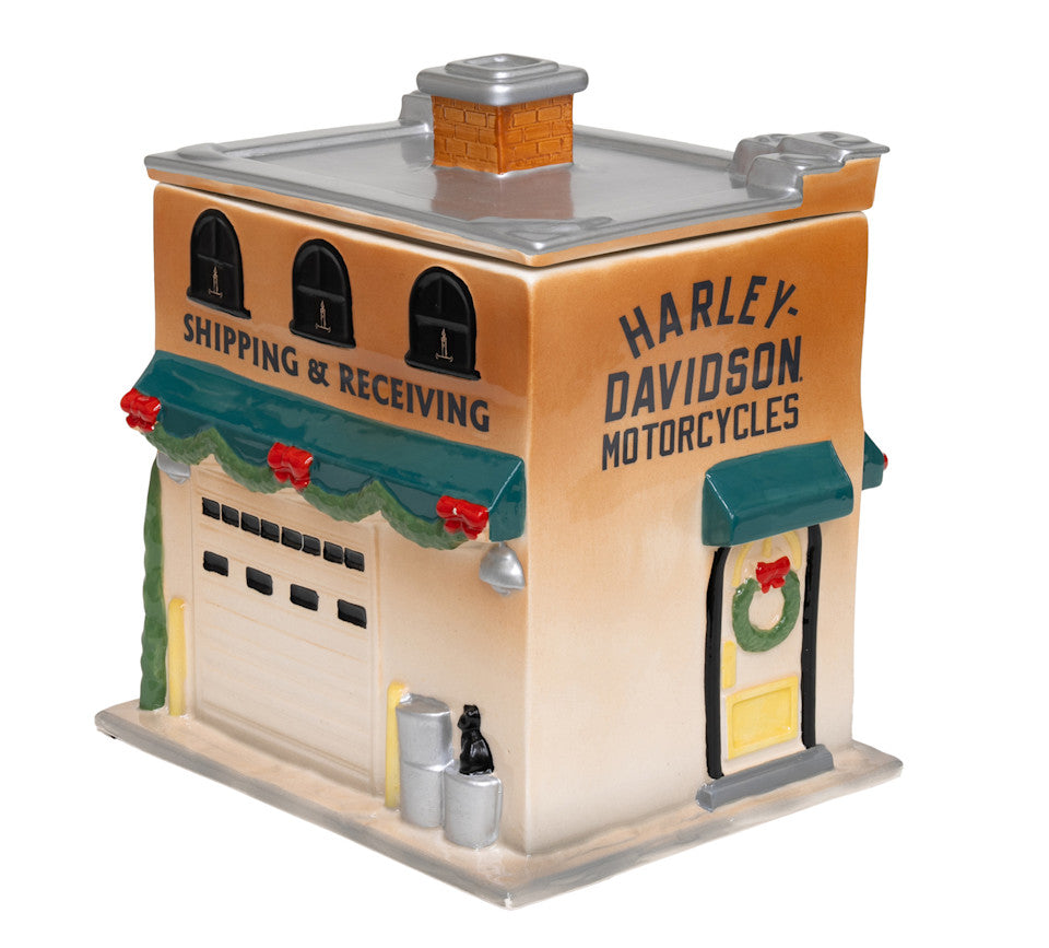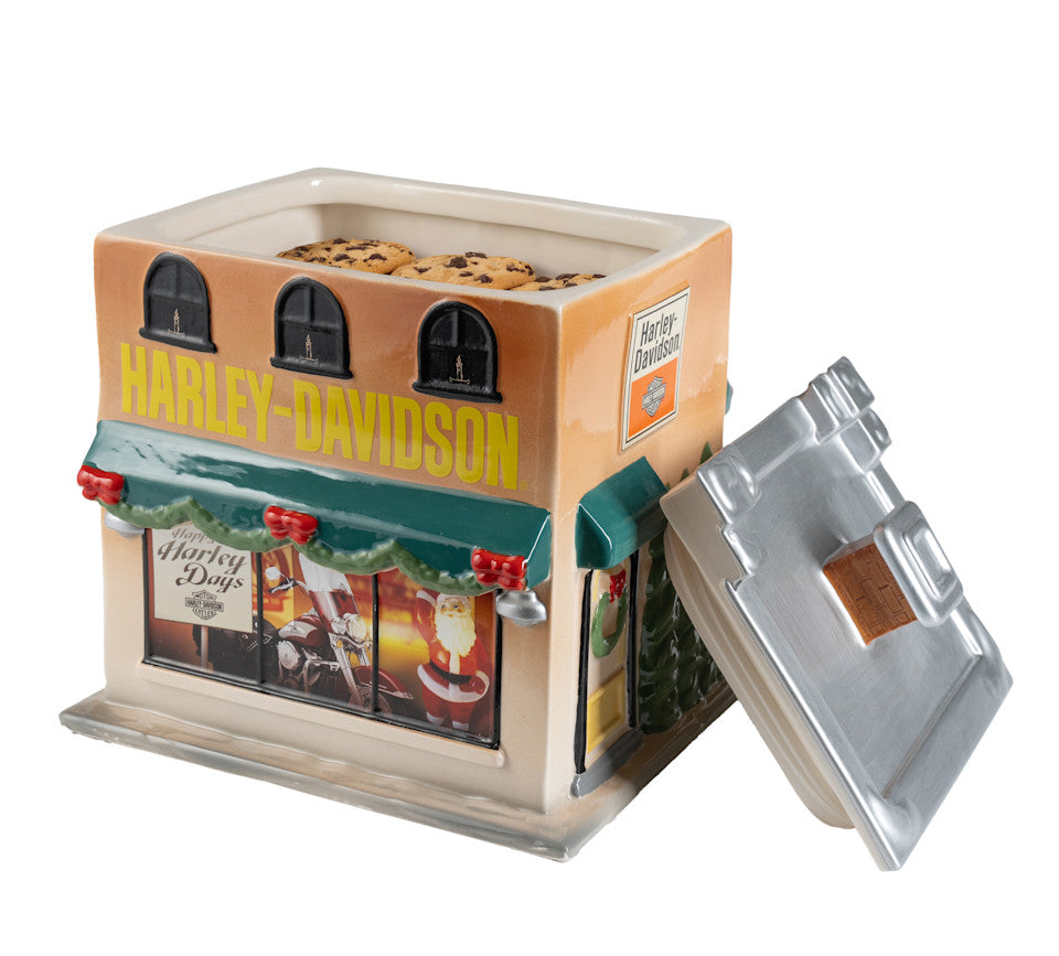 Custom sculpted Harley-Davidson Dealership cookie jar. Silicone lid seal to preserve freshness. Hand Wash Only.
