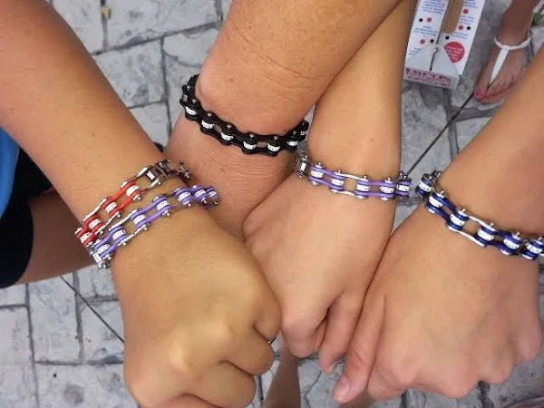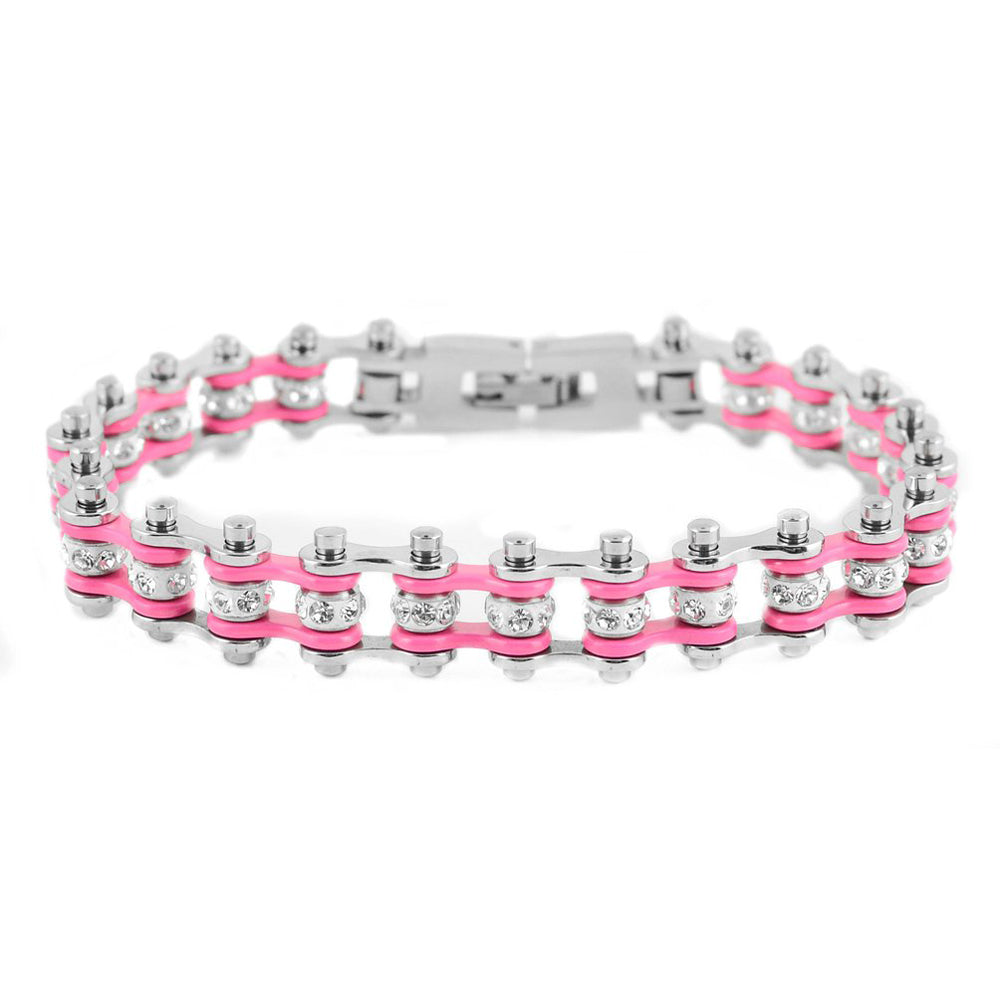 The ladies here at YH-D, are in love with these bike chain bracelets. They are just dainty enough to go with jeans or dressed up and out on the town. Made of stainless steel with a gorgeous finish and crystals in the centers.
