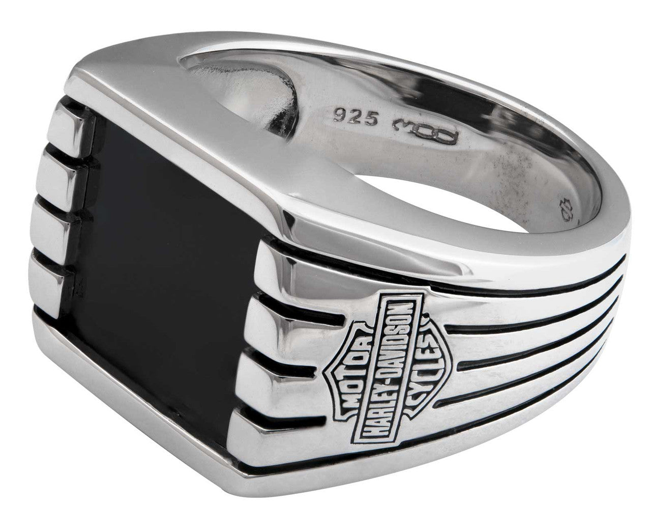 Harley-Davidson® Men's B&S Steel Lines Ring - Silver & Black, HSR0104. Features iconic Bar & Shield logo on each side. Made from durable, high-quality Stainless Steel. This ring will hold up ride after ride. Hand crafted with the highest attention to detail and quality. HSR0104