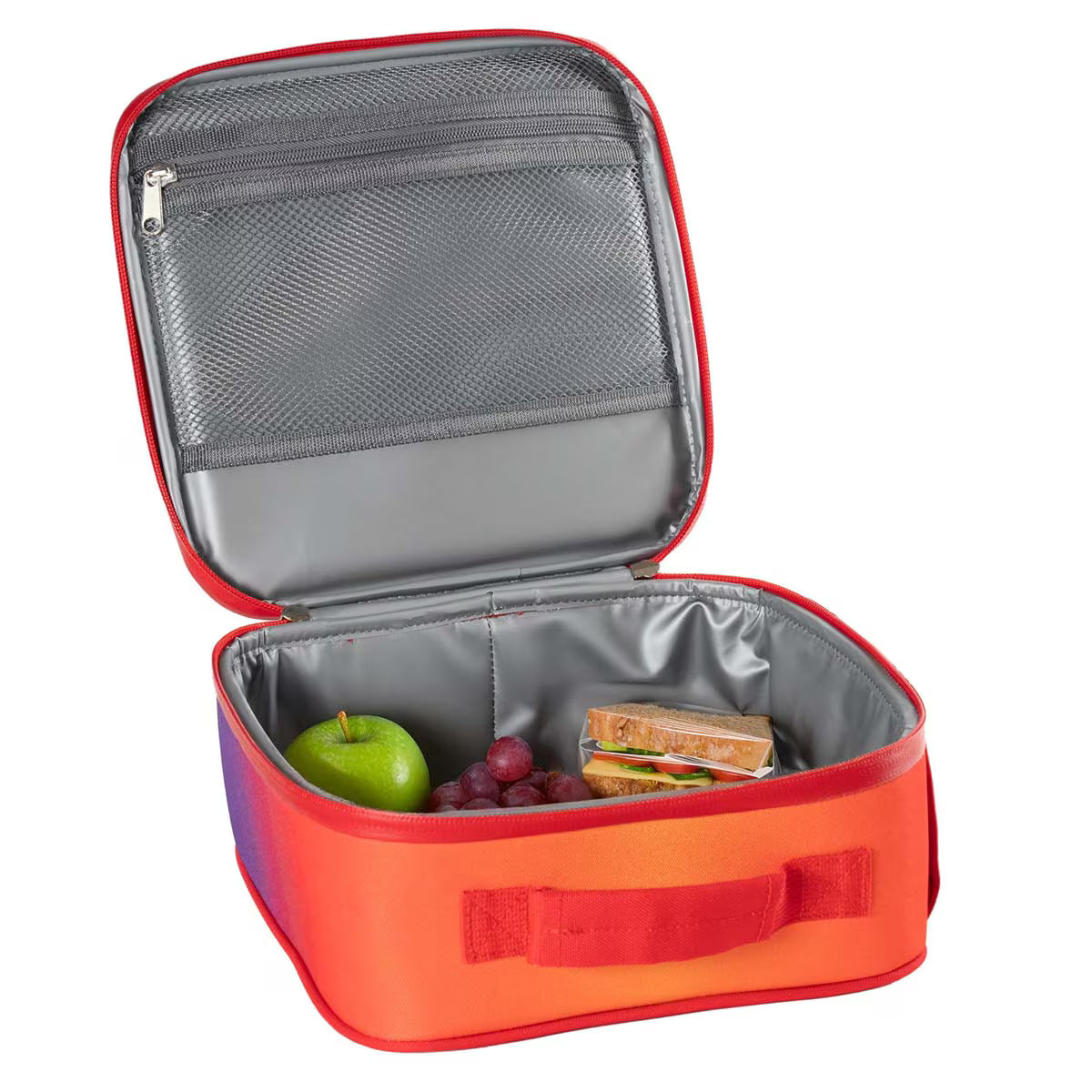 Insulated soft lunch box with leakproof zipper, front and side pockets and waterproof lining. Vivid Bar & Shield Eagle graphic. Dimensions: 9.5" W x 9.5" H x 4.3" D / 24 x 24 x 11 cm