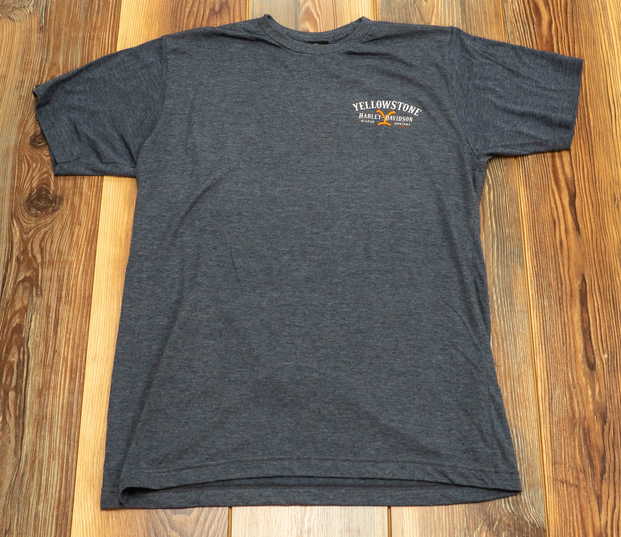 This is Yellowstone Harley-Davidson's brand new t-shirt, branded with our name. Catch this heathered navy, super soft t-shirt before they are gone. With our YH-D cowgirl and location in Belgrade, Montana. We brought the pin-up girl back!