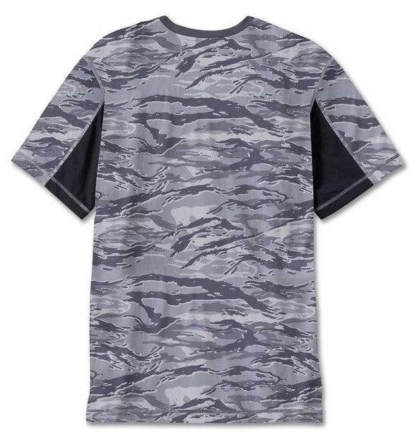 Harley-Davidson® Men's Factory Performance Tee - Black Camo, 96036-24VM. Made from 88% polyester and 12% spandex midweight jersey. Rib-knit neckline. Contrast mesh sleeve piecing. Custom allover camo print. Soft-hand printed Bar & Shield logo graphics. 96036-24VM
