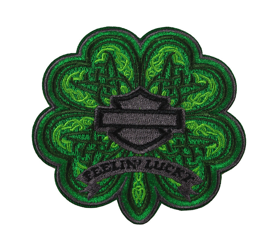 Harley-Davidson® "Feelin’ Lucky" Patch, Size: 3.5”. With bold block lettering and a confident clover design, this patch lets the world know you ride with a bit of luck and a lot of attitude. Vivid green and black embroidery give it a crisp, eye-catching contrast, framed by clean stitching. A playful emblem for riders who believe that fortune favors the fearless.