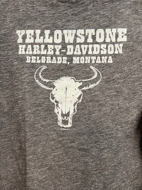 The HD Steep Long-Sleeve is a must-have for any Harley Davidson enthusiast. This ladies' grey laced-up V-neck top features thumb holes, the iconic Harley Davidson script, adorned with wings, along the vertical line. The back showcases a striking steer skull, adding an edgy touch. Stay stylish and show off your love for Harley with this long-sleeve top.