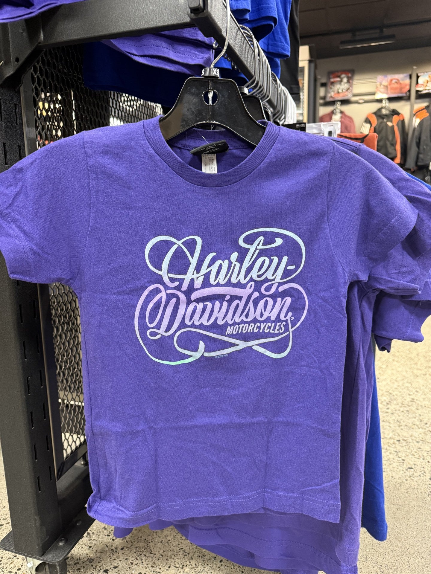 Enjoy this purple kid's t-shirt with "Harley-Davidson Motorcycles" on the front, and a classic Yellowstone Harley-Davidson Bar and Shield with our location in Belgrade, Montana.