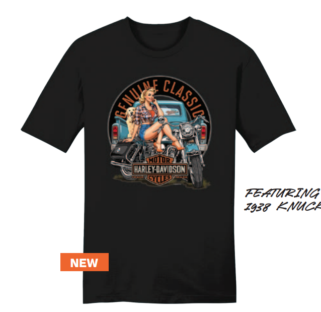 Turn heads with this bold black dealer tee celebrating Harley-Davidson’s legendary motorcycling heritage. Featuring a striking “Genuine Classic Motor Harley-Davidson Cycles” graphic, the design showcases a vintage-inspired pin-up alongside an iconic 1938 Knucklehead, capturing the raw attitude and timeless style of early American motorcycling.