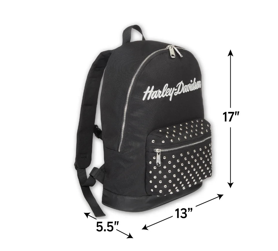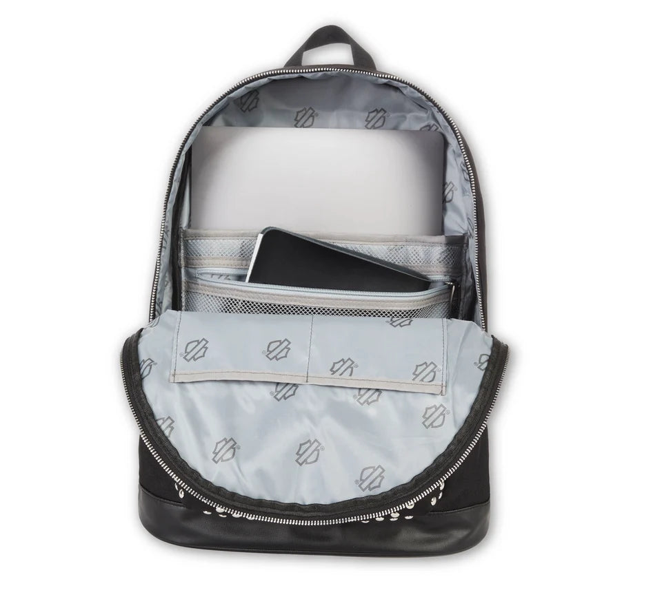 The zippered main compartment opens to a branded, lined interior with multiple interior organization pockets