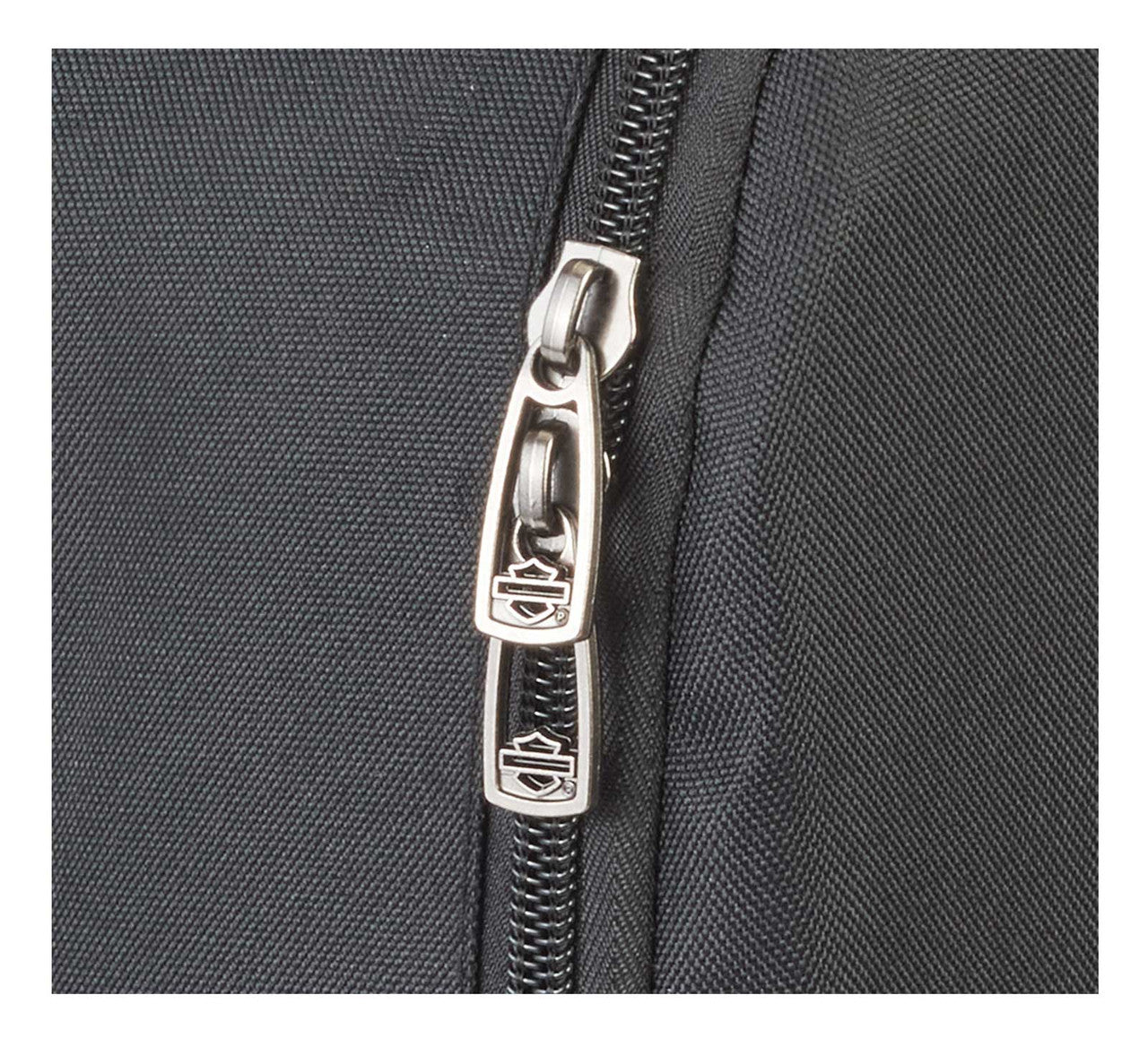 Harley-Davidson® Bar & Shield Graphic Backpack - Black, 90815-BLKORG. Made from rugged, high density polyester. Zippered main compartment with front accessory pocket. Padded and adjustable backpack straps along with top carry handle. Size: 17" x 12.5" x 5".