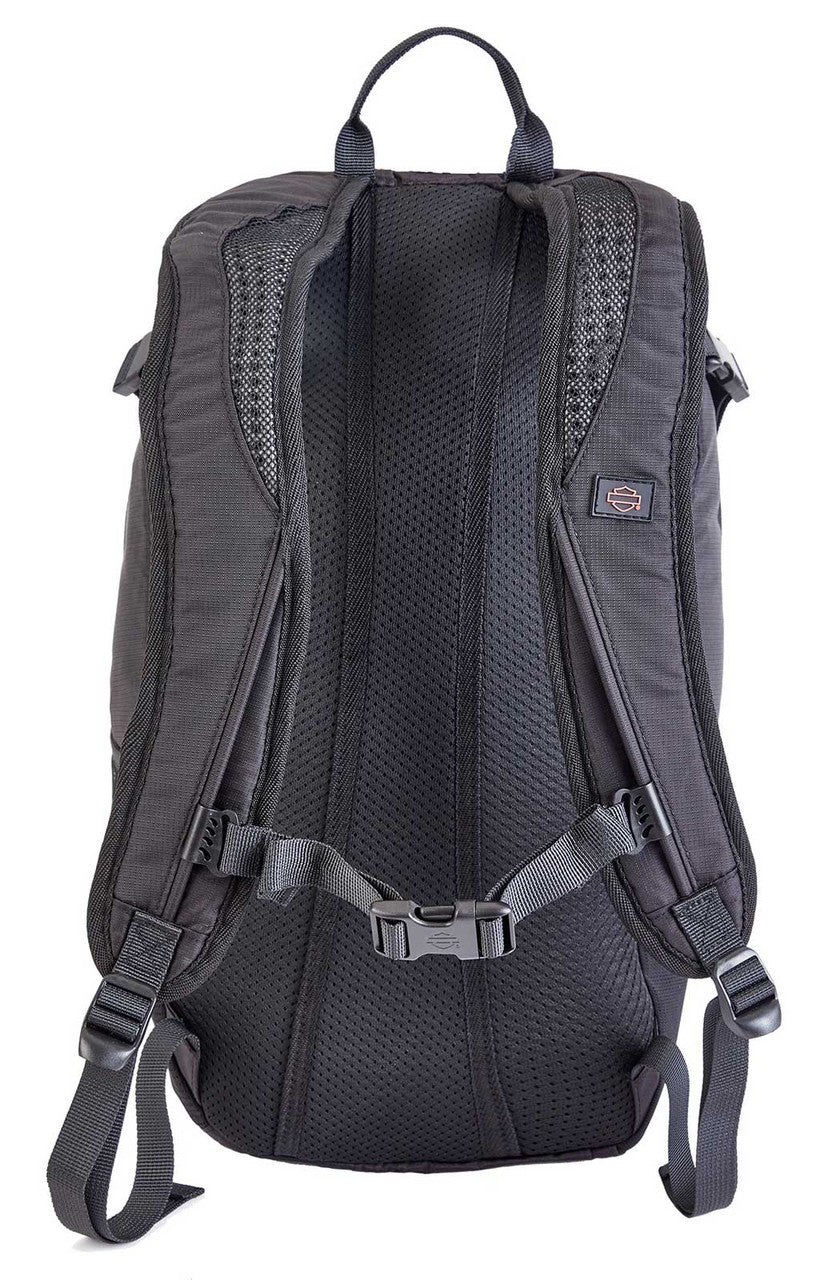 Harley-Davidson® Zero Gravity Backpack - Black, 90229-BLK. Lightweight and travel-ready. Zippered accessory pockets to secure personal items. Fully padded straps and cushioned back panel with air-mesh for carrying comfort. Constructed from water-resistant polyester. Features an embroidered classic Bar & Shield logo. Size: 18" x 10" x 6".