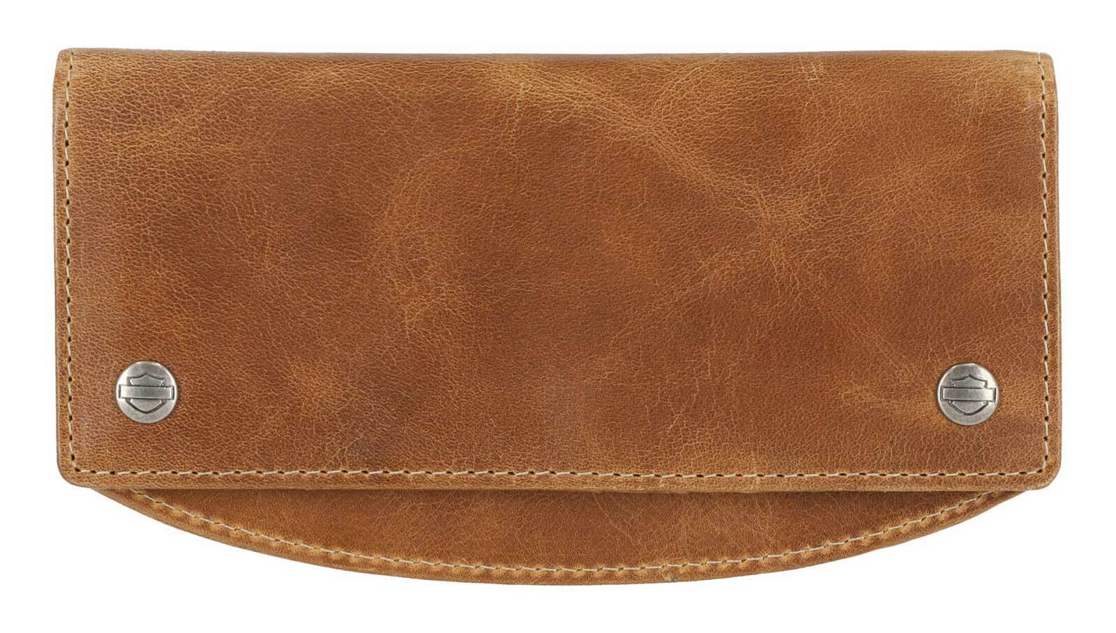 Harley-Davidson® Men's Smooth Grain Snap Flap Pocket Long Biker Wallet - Brown, MWM011/35. The perfect wallet for any biker: simple, durable, and stylish. Antique nickel finish, on Brown genuine leather. Four card slots, ID window, large slip pocket. Two snap closures and RFID protection. Comes with a removable leather leash. Size 6.8" x 3.58". MWM011/35