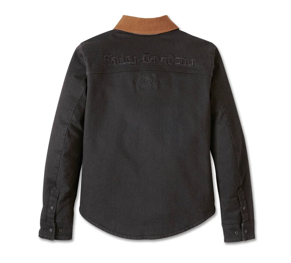 Design Details: Contrasting corduroy hidden snap-down collar.