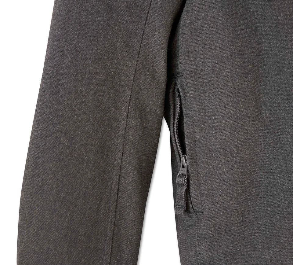 Pockets: Snap flap chest pockets. Right side seam stash pocket with zipper closure.