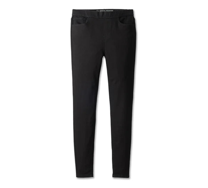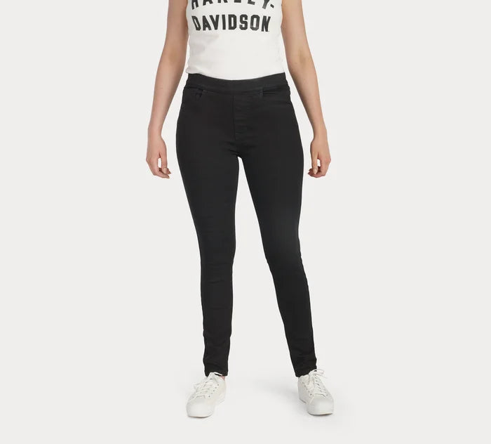 Comfort rules whenever you wear our H-D High Rise Skinny Pull On Jeans. The high-rise waist gives more coverage while you ride, and the slim fit moves with you as it flatters your shape. Made from a blend of cotton, elasterell, lyocell, and spandex for maximum stretch and durability. Finished with a new branded leather patch and an added comfort bonus—a printed inside waistband versus a traditional (and sometimes itchy) label.