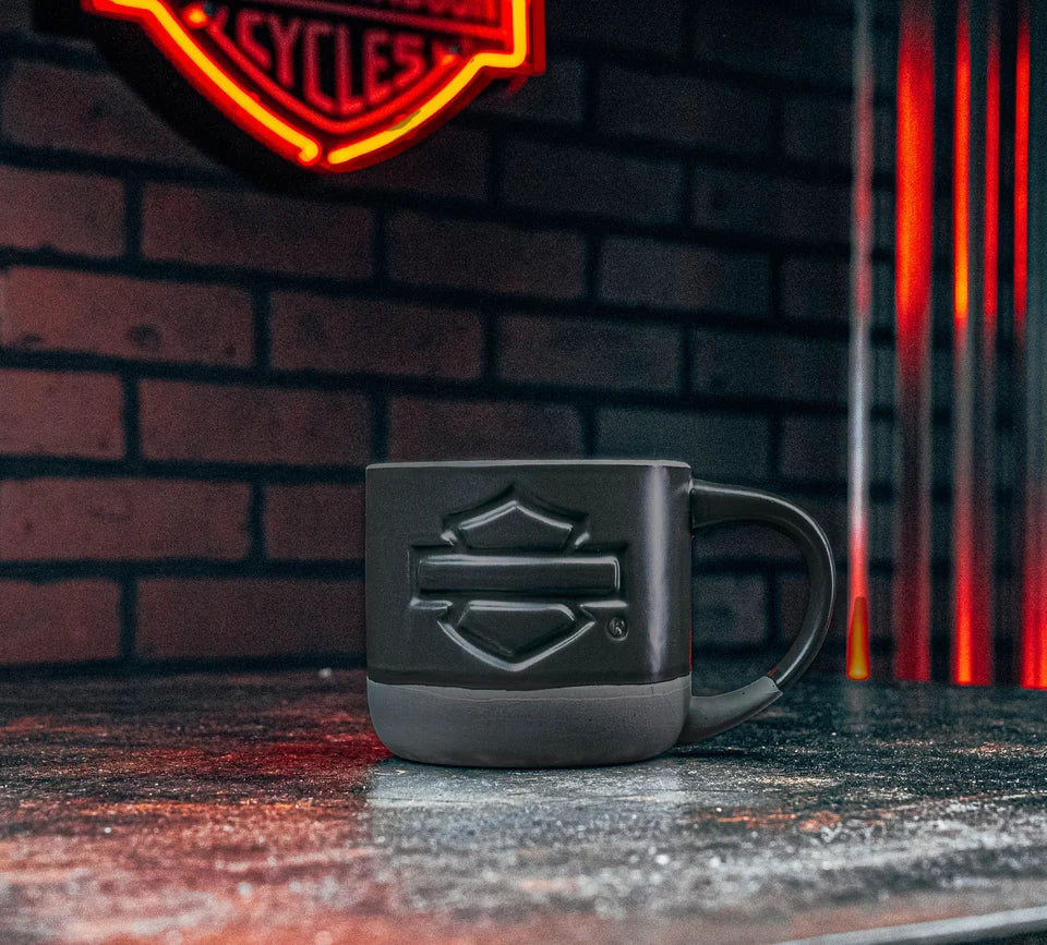 13 oz. Pottery-style ceramic mug. Tonal grey and black mug with debossed Open Bar & Shield logo. Dishwasher and Microwave safe.