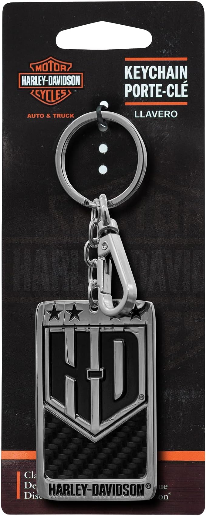 Harley-Davidson 2-Sided Keychain comes in detail that is unmatched. This keychain has two uniquely designed sides. On one side an American flag and the other side H-D Initials with a beautiful carbon Fiber inlay. Product includes both a key ring and oval clip to make attachment easy to anything. These key chains are designed and manufactured to prevent peeling, cracking or fading. Show off your personality with this multi-use keychain today!