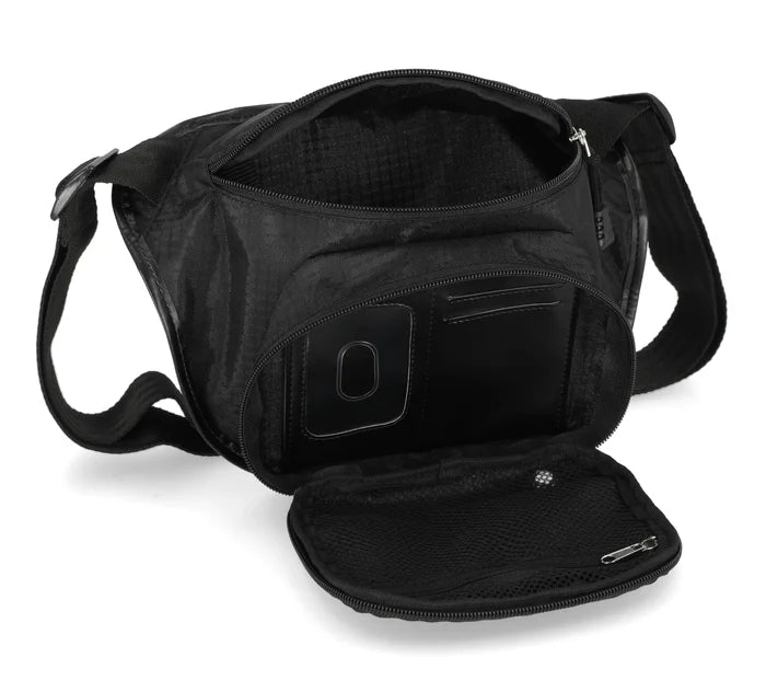 Versatile, edgy and comfortable, this H-D hip bag is a must have to carry all your essentials in style. Front pocket keeps you organized with ID window, slip pockets and extra storage. Main entry is roomy!