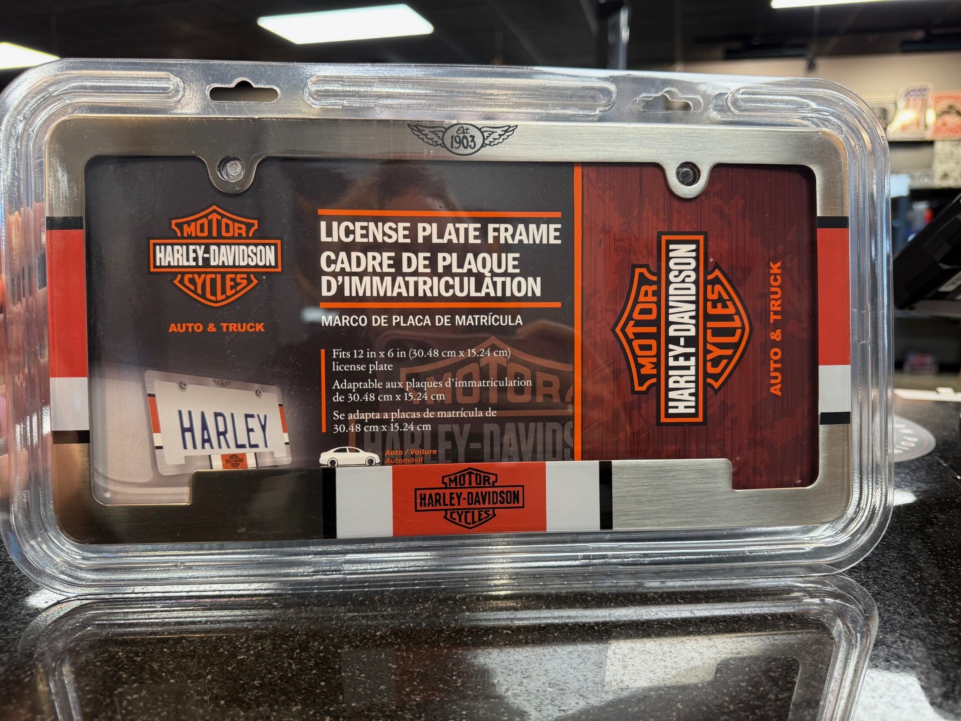 Chrome with classic long logo orange, black and white accents. This license plate frame brings your passion for all things H-D to your vehicle as well.