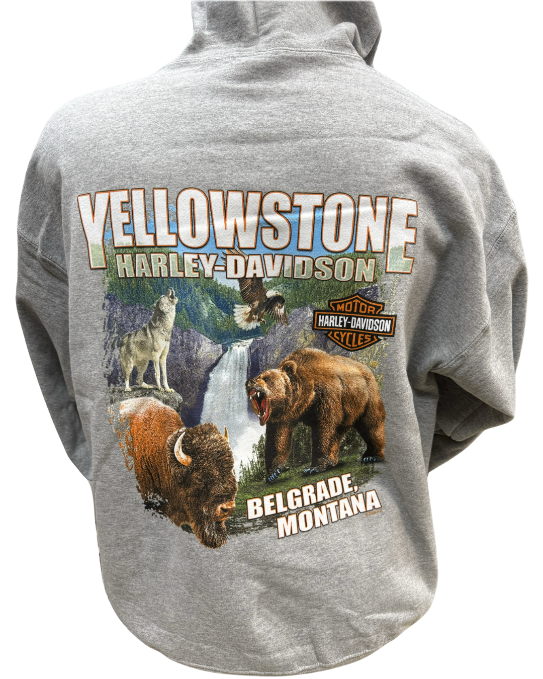 This grey 50/50 blend hoodie features the historic long-logo bar and shield on the front, "Harley-Davidson" down one sleeve, and our YH-D "Roar" color-color graphic on the back.